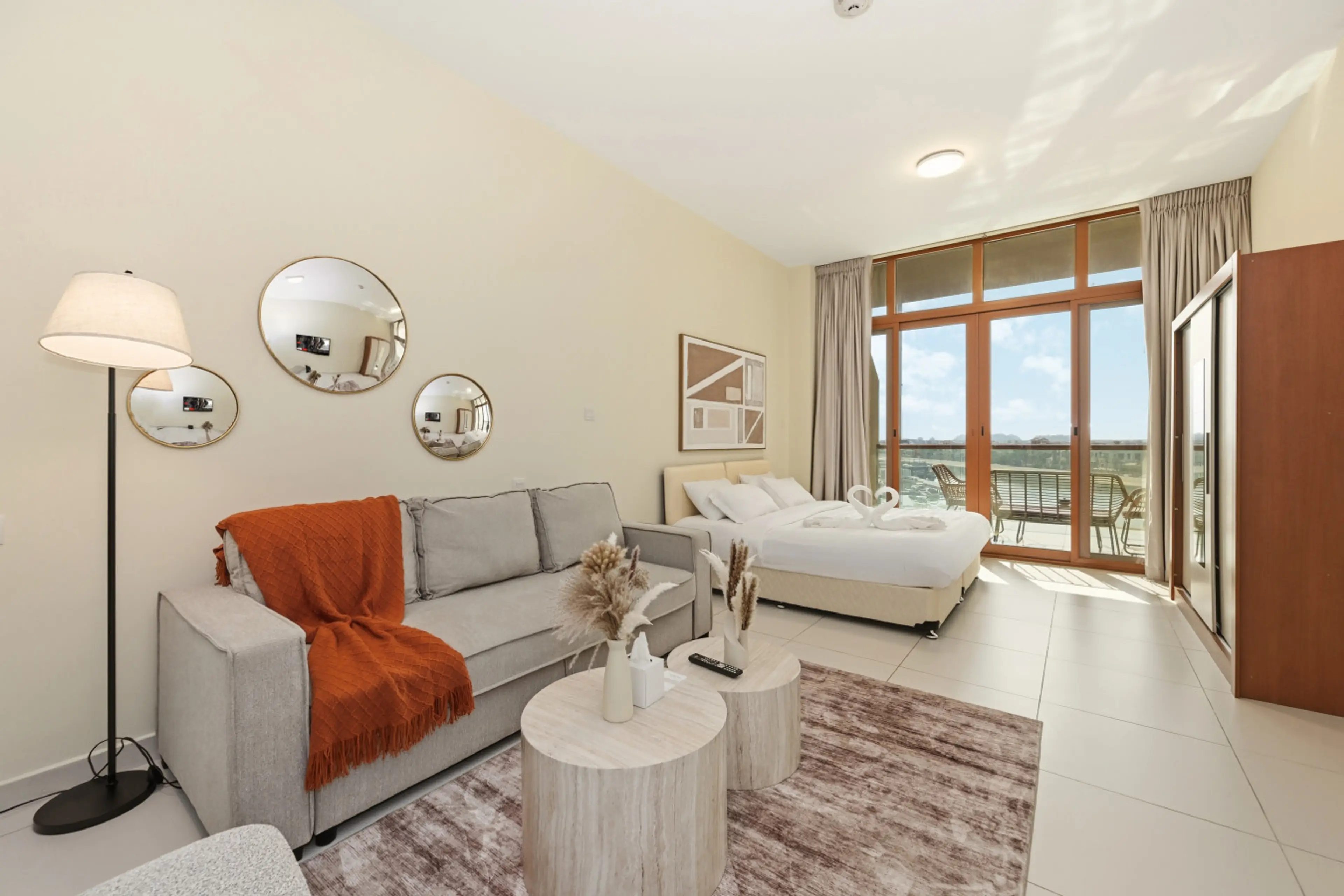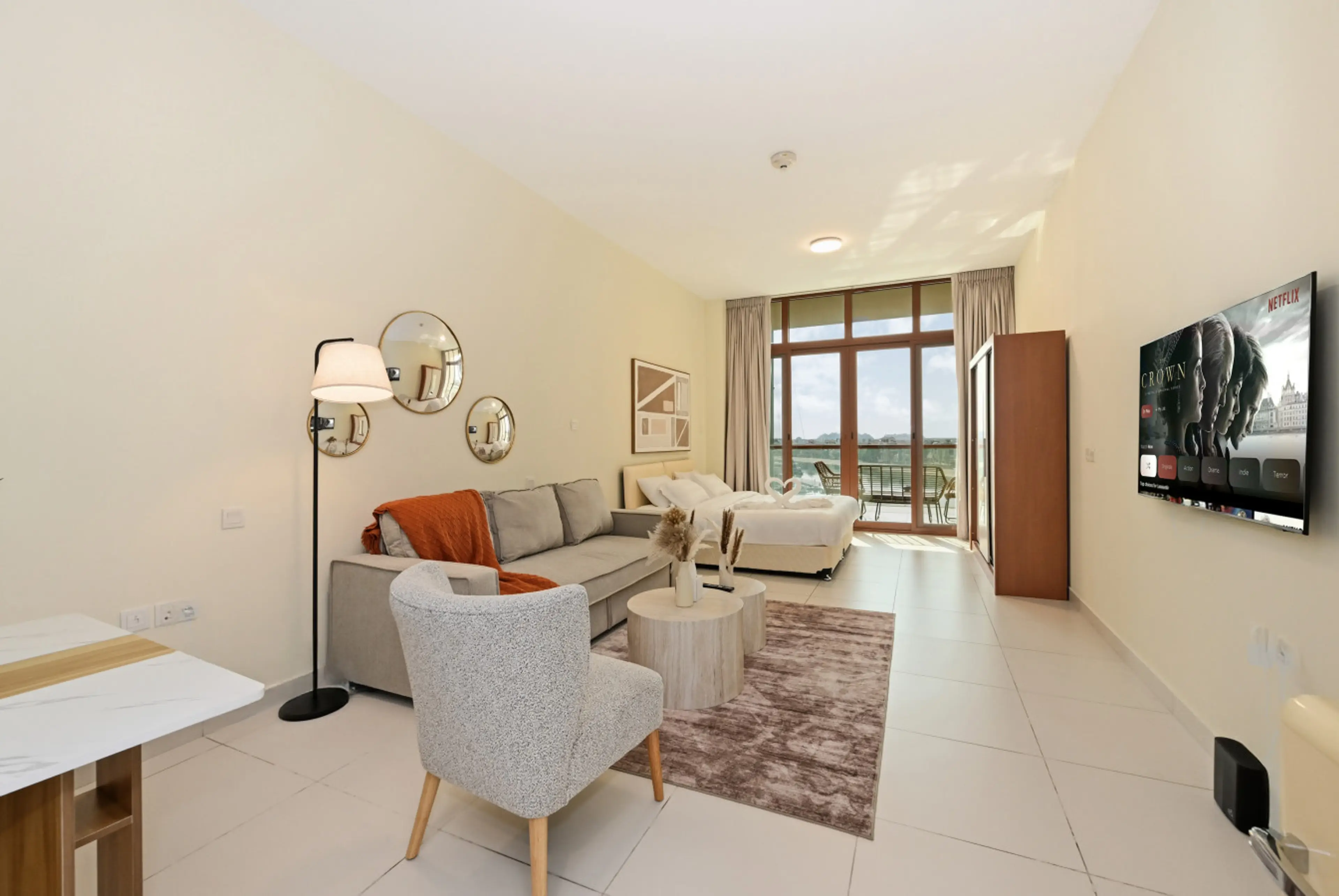 Wake up to sweeping views of yachts, the Arabian Gulf and the towering Dubai Eye from your private balcony on Palm Jumeirah. This stylish waterfront studio in the Azure Residences sleeps up to four guests and offers direct access to the beach, promenade and resort‑style amenities. Inside the studio...